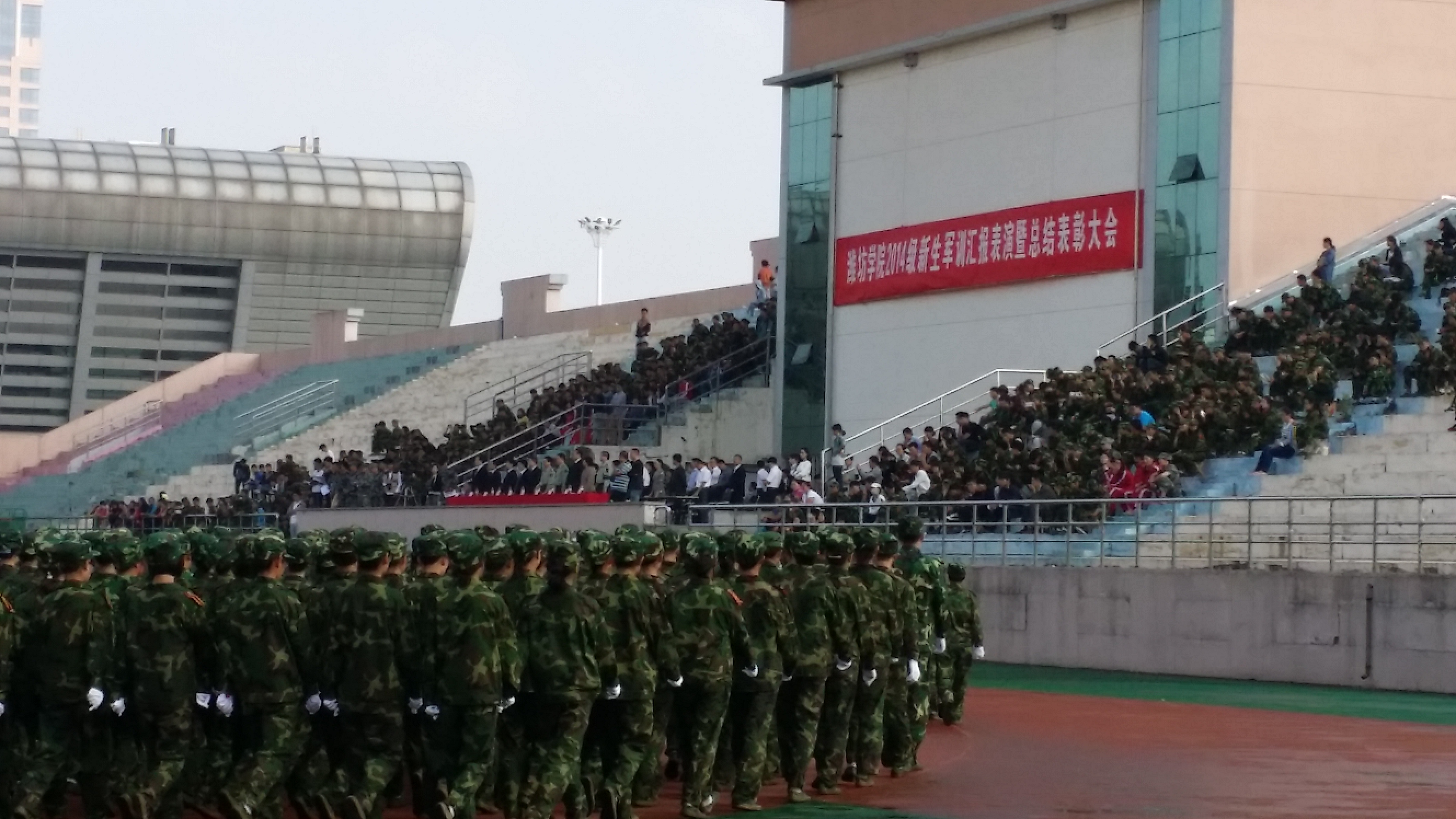 9月29日上午,2014级新生军训阅兵式在操场隆重举行。