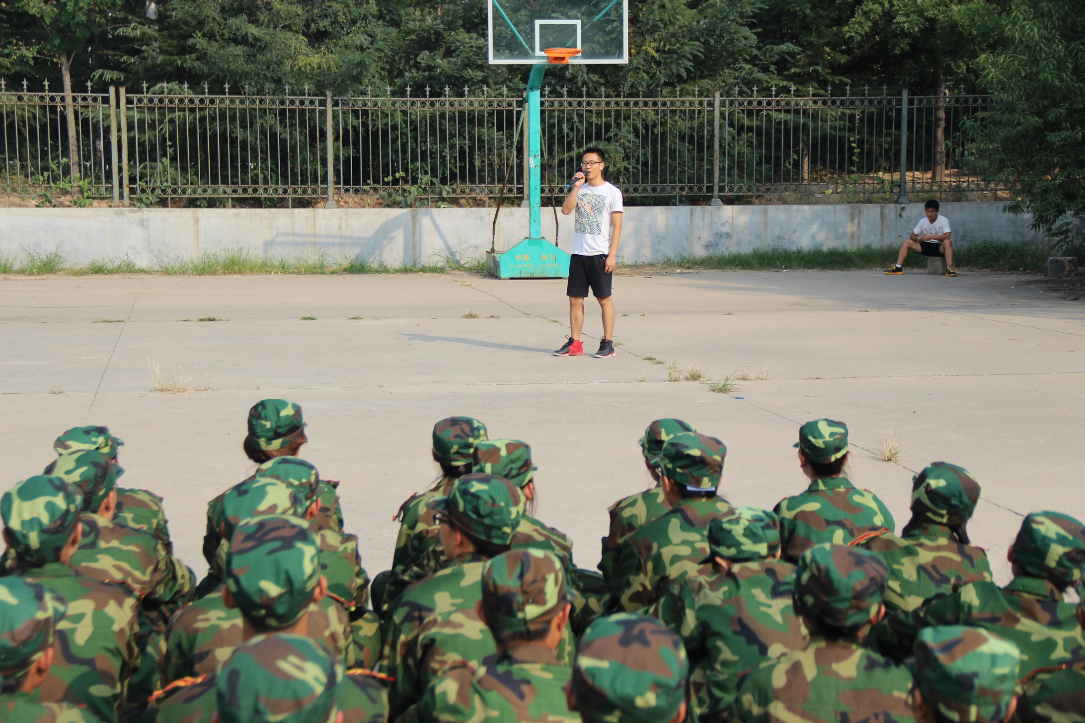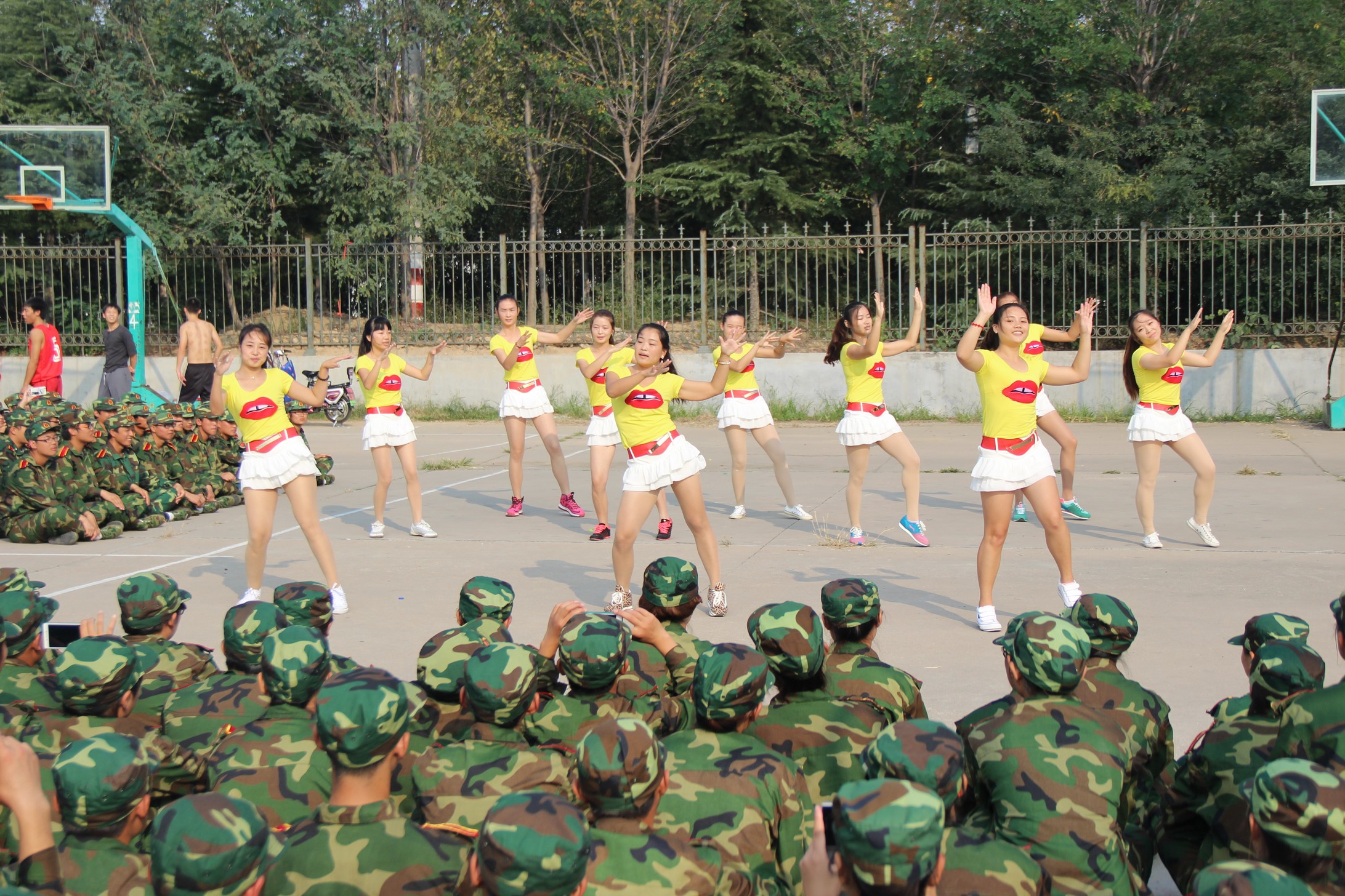 在军训休息间隙,两个方队在篮球场绕成方形舞台。2012级12名队员组成的啦啦操队伍在青春洋溢的音乐声中,拉开了本次活动的序幕。接下来是才艺表演,大一新生的《故乡》,唱出了第一次离家在外求学思念故乡的热切的心,又隐隐包含着离开家乡追求青春理想,实现心中梦想的丝丝喜悦;大三学哥的《雨一直下》,用坚定的音调,缓缓道来的旋律,告诉大一的新生在本应做梦的年纪,一定要记得自己最初的梦想,并且为了完成它在自己选择的大学里努力奋斗;最后,学姐们的一段《小苹果》热舞,赢得了无数掌声,用青春唤醒梦想蓄积力量,相约体院共同奋斗。