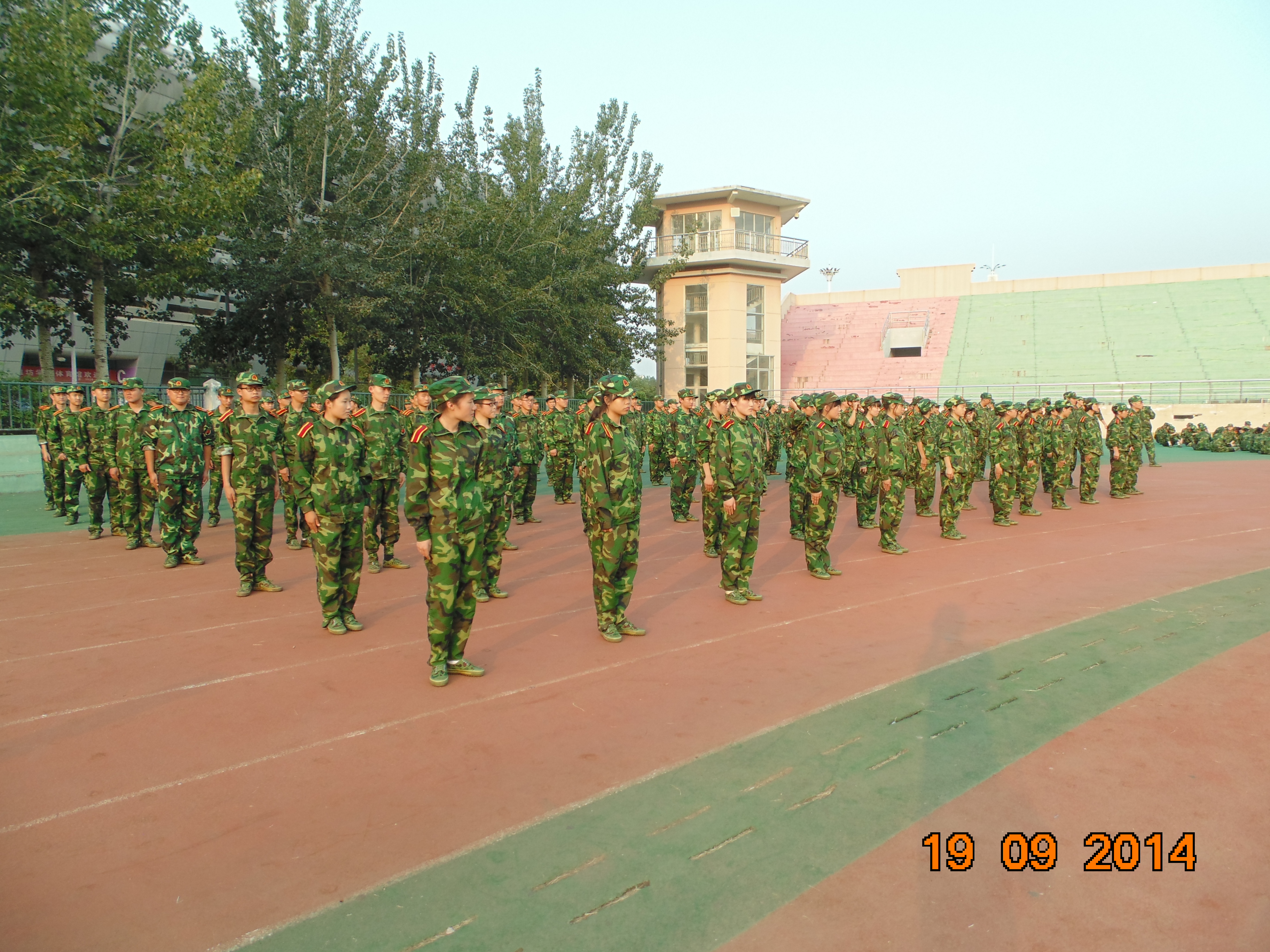 潍坊学院2014 级新生的第一节课军训已经开始了!本届军训教官是山东省济南军区的战士,军训地点主要分布在运动场和樱花路,建筑工程学院的学生们被安排在体育馆东部和运动场东北角。