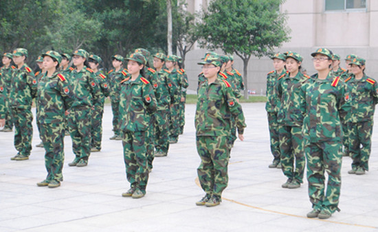 9月16日下午,外国语学院2014级新生身穿军绿色迷彩服在至善楼集合,笔直地站在水泥地上等待着教官的到来。