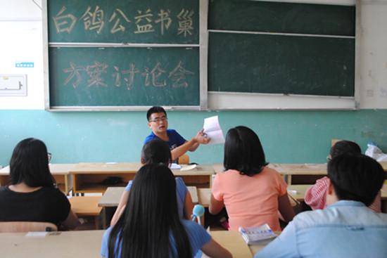 9月10号中午12点外国语学院学生会于3233教室召开白鸽公益书巢方案讨论会,白鸽志愿服务中心主任李志辉主持,学生会各部门主任针参与讨论。