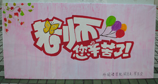 据了解,为了迎接教师节,外国语学生会开展多种形式的活动喜迎教师节。如:发送电子贺卡、“感谢恩师”诗歌朗诵会、在“心雨横幅”上签名寄语等形式表达对老师的无限爱意、真心的祝福及衷心的问候。