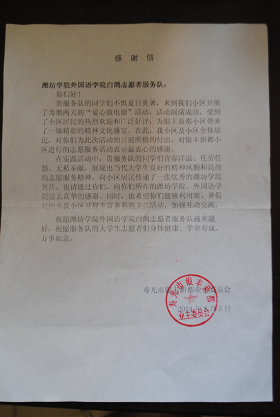 7月20日到30日在2014大学生志愿者暑期文化 、科技 、卫生“三下乡”社会实践活动期间,由外国语学院10名师生组成的“青春放映队”到 潍坊市高新区部分社区、街道 免费放映电影。日前,银丰新都业主委员会、村委会等单位陆续寄来的感谢信,表达对大学生深入社区,服务社区的赞扬之情。