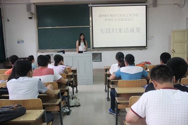 物理与光电工程学院于2014年9月4日举行了2014年大学生暑期社会实践总结交流会,物电学院辅导员办公室副主任张芳芳老师、学生会主席团和暑期社会实践各分队队员参加了此次交流会。