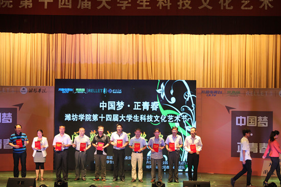 潍坊学院第十四届大学生科技文化艺术节颁奖典礼于2014年6月12日下午4时在图书馆一楼大厅圆满结束。此次大学生科技文化艺术节以“中国梦·正青春”为主题,在经过了多个项目的比赛之后,科技文化艺术节接近尾声,颁奖典礼在此隆重举行。