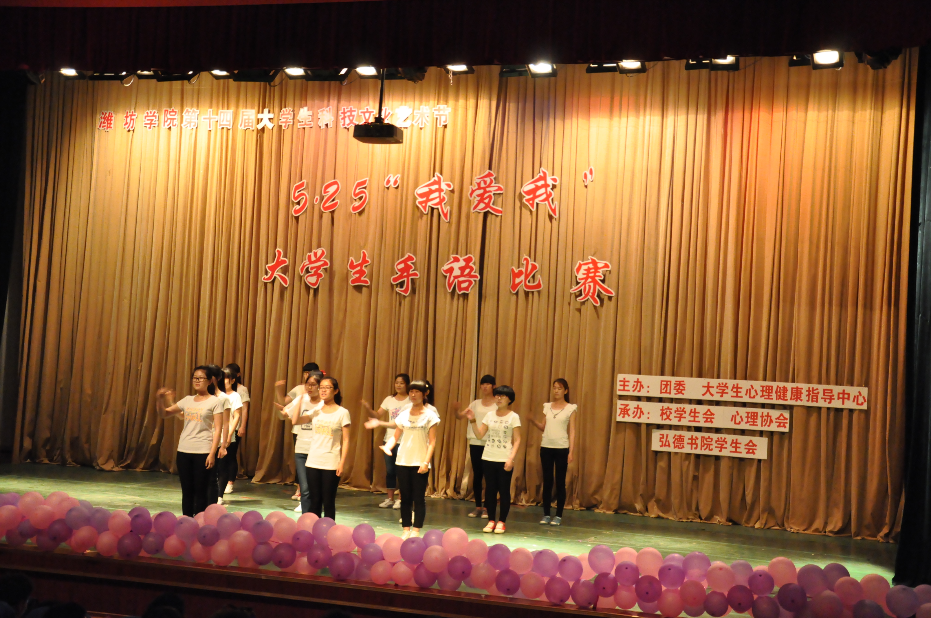 5月25日晚七点,由团委、大学生心理健康指导中心主办,校学生会、心理协会、弘德书院学生会承办的5.25“我爱我”大学生手语比赛在图书馆报告厅隆重开幕。来自各院系的十六个代表团参加了本次比赛。