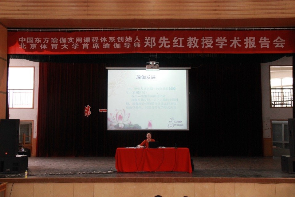五月二十九日下午三点,应体育学院老师邀请,中国东方瑜伽实用课程体系创始人,北京体育大学首席瑜伽导师郑先红在音乐学院报告厅开始了瑜伽的讲座。体育学院院长杜建国出席并主持了此次报告会,大二大三辅导员,以及体育学院学生参加了此次报告会。