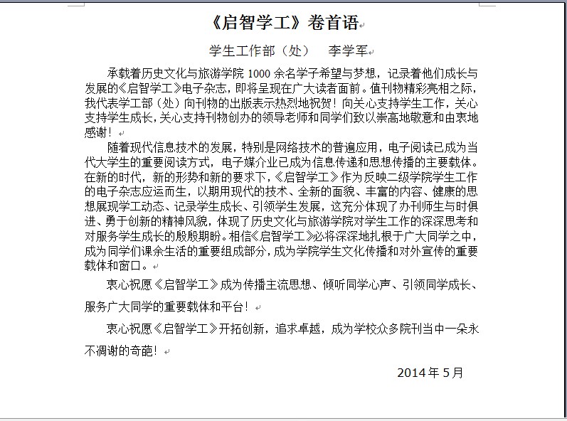 《启智学工》是寄托着历史文化与旅游学院全体师生殷切希望的一部学工刊,它以其独特的结构框架和丰富新颖的内容形式备受学生们的欢迎。在集思广益,博采众长之后,《启智学工》的雏形已渐渐形成,为了使本次创办的学工刊深受老师青睐以及同学们的热烈欢迎, 《启智学工》历经数次删改,耗时近几个月,最后才逐渐呈现在大家面前。与此同时,本着虚心请教的态度,历史文化与旅游学院新闻部还特意邀请了大学生在线学生工作处的李学军处长为此次创办的学工刊作卷首语。李学军在认真了解了《启智学工》的相关构思以及工作流程后,对历史文化与旅游学院创办的电子杂志给予了高度评价和充分肯定。从他所作的卷首语中不难看出,他是以一种期待的心情、祝贺的态度、鼓励的言语来对历史文化与旅游学院的学工刊送祝福。李学军在充分肯定此次电子杂志的呈现同时,还对电子杂志的产生条件进行了分析,他指出:“随着现代信息技术的发展,特别是网络技术的普遍应用,电子阅读已成为当代大学生的重要阅读方式,电子媒介业已成为信息传递和思想传播的主要载体。”在此形势下,《启智学工》才应运而生。《启智学工》的出现与其说是一种新思维的体现,倒不如说是新形势、新背景下的产物,是顺应时代发展潮流的成果。李学军的言语中透漏着一种对《启智学工》的美好希冀,他毫不吝啬地鼓励历史文化与旅游学院的本次电子杂志能够长久运行,并且他还希望在全体师生的共同努力之下《启智学工》能够成为历史文化与旅游学院对外传播的窗口。