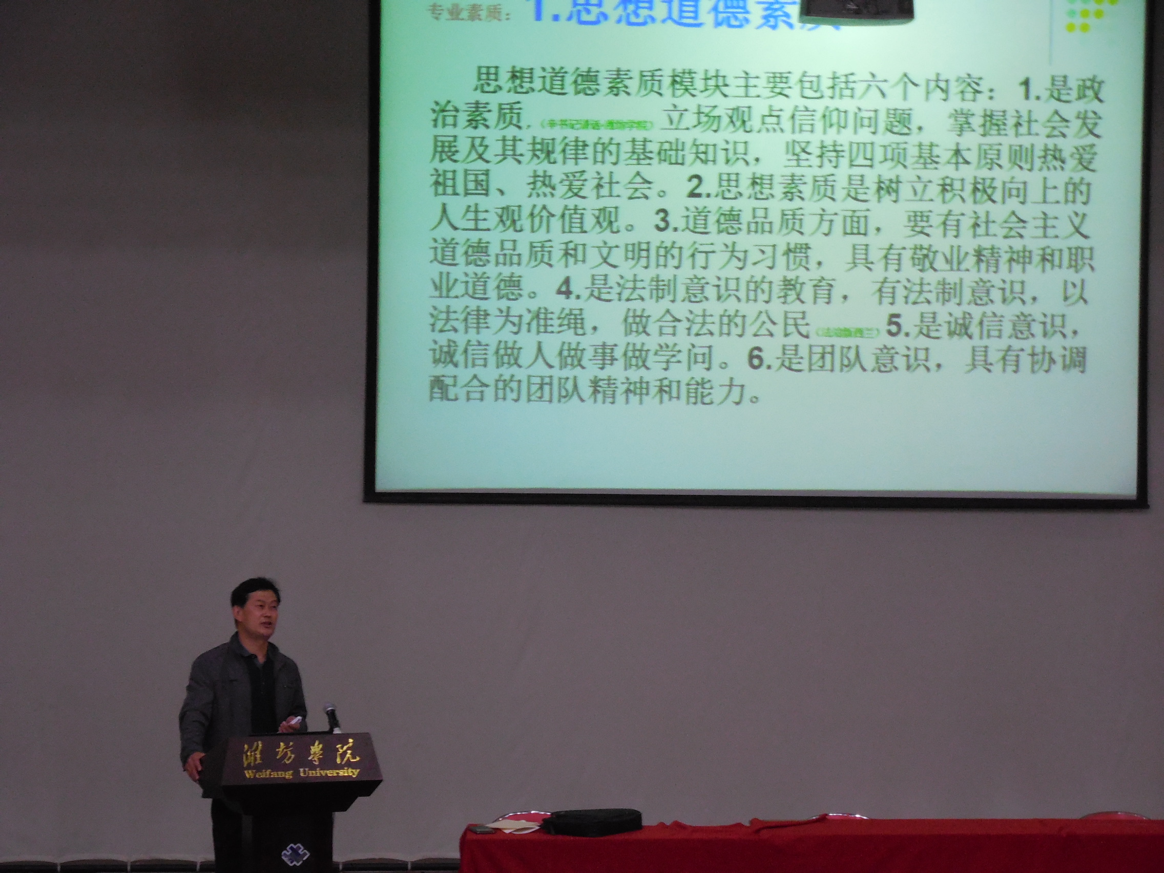 在报告会正式开始前,刘院长首先给同学们播放了08级学长参加“结构设计大赛”的花絮,通过短短的十分钟让同学们了解了其中的汗水与艰辛,经历的失败与成功,老师帮助同学们分析原因,寻找失败点,再接再励,最终通过他们的不懈努力和坚持不懈,获得了山东省结构设计大赛一等奖。接着他继续说道:“本次报告会不应仅局限于工科竞赛,还有对理工科大学生专业的素质和专业能力的培养。”他提出首先是对思想道德素质的培养,态度端正才能做好事情。其次,对专业要求是要培养逻辑思维和理性能力,还有就是身心素质的培养,读万卷书也不要忘记行万里路。最后就是提高自己的表达能力,不仅是语言组织能力还有外语方面,好的公司招聘都对英语四六级有要求,考研也要求过英语四六级。多完善自己才能为自己未来增加一份成功的筹码。最后老师就竞赛进行了说明,展示了历届的获奖结构模型,精美的结构模型让人引起无限遐想,引起同学们的阵阵掌声,老师还对模型进行了说明需要测量哪东西,哪些方面需要引起注意等进行了介绍。