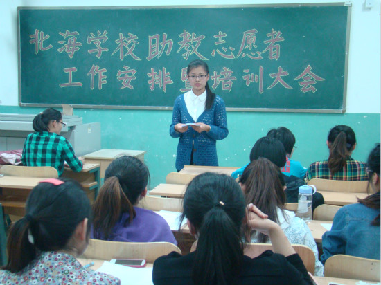 5月19日晚,外国语学院在至善楼3127教室开展了北海学校助教志愿者工作安排暨培训大会,曾获山东省师范类教师从业技能大赛第一名的11级李晓燕和刘晓玲,还有35名经过两轮选拔脱颖而出的第一批助教学生参加了此次大会。