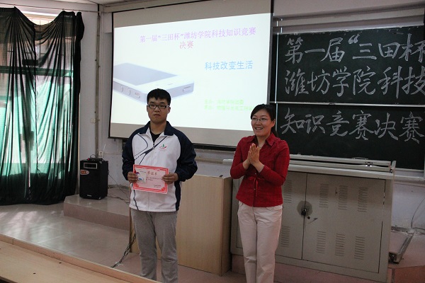 知识碰撞火花,智慧点燃激情,经过初赛的角逐有8个学院进入了第一届“三田杯”科技知识竞答决赛,2014年5月15日下午3点激烈的比赛在5210如约举行,莅临本次比赛的有潍坊学院团委副书记张晓静老师,物电学院党总支副书记仲明礼老师,物电学院团总支副书记张芳芳老师,各队参赛人员和观众参加了此次大赛。 一切准备就绪之后,主持人宣读完比赛要求和规则后比赛正式开始了。比赛共分为必答、抢答、选答三个环节。各支代表队都认真积极的回答了第一轮的问题,过程中不断有掌声响起。经过第一轮必答题环节激烈角逐后,各支代表队的差距逐渐开始凸显。第一环节结束统计分数期间,同学们一起欣赏了一段精彩的街舞表演,现场气氛一片活跃。随后进入规定抢答题阶段。这一轮各支队伍的表现更加精彩,及表现处理极好的反应能力也凸显处理良好的答题能力。经过又一轮的竞赛,各参赛队伍的差距越来越大,尽管如此分数靠后的队伍并没有放弃而是在选答题环节努力迎头赶上,他们的参赛精神赢得了所有人的掌声和喝彩。经过三轮竞赛,评审团根据答题情况全面考量给分。最终八支代表队评比出了一、二、三等奖,并有莅临大赛现场的领导为获奖队伍代表和优秀组织单位颁奖。大赛最后,由物电学院党总支副书记仲明礼老师做了重要讲话,他向组织并此次大赛的全体人员表示了感谢,并鼓励同学们通过参加此次比赛增加更多的科技知识,培养自己的科技应用能力。 下午4点半本次大赛完美落幕,通过举办比赛很好的培养和提高同学们的科普知识,其涉及方面包括多个领域多方面的知识。并在比赛中培养大家的团队协作能力。通过竞赛提高了同学们的学习兴趣,增长知识,把科技运用于生活,培养科技创新的精神.增强实践的意识和能力。(王晓雪 王瑞纯) |