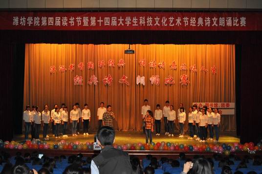 为了贯彻党的十八大精神,践行社会主义核心价值观。5月14日晚上7点,潍坊学院第四届读书节暨第十四届大学生科技文化艺术节“经典诗文朗诵”决赛在图书馆报告厅举办,诗文朗诵以“沐浴书香陶醉经典、诵读诗意品味人生”为主题,此次活动由图书馆、团委主办,校学生会承办,法学院作为12个参赛院系之一参加了诗文朗诵的决赛。