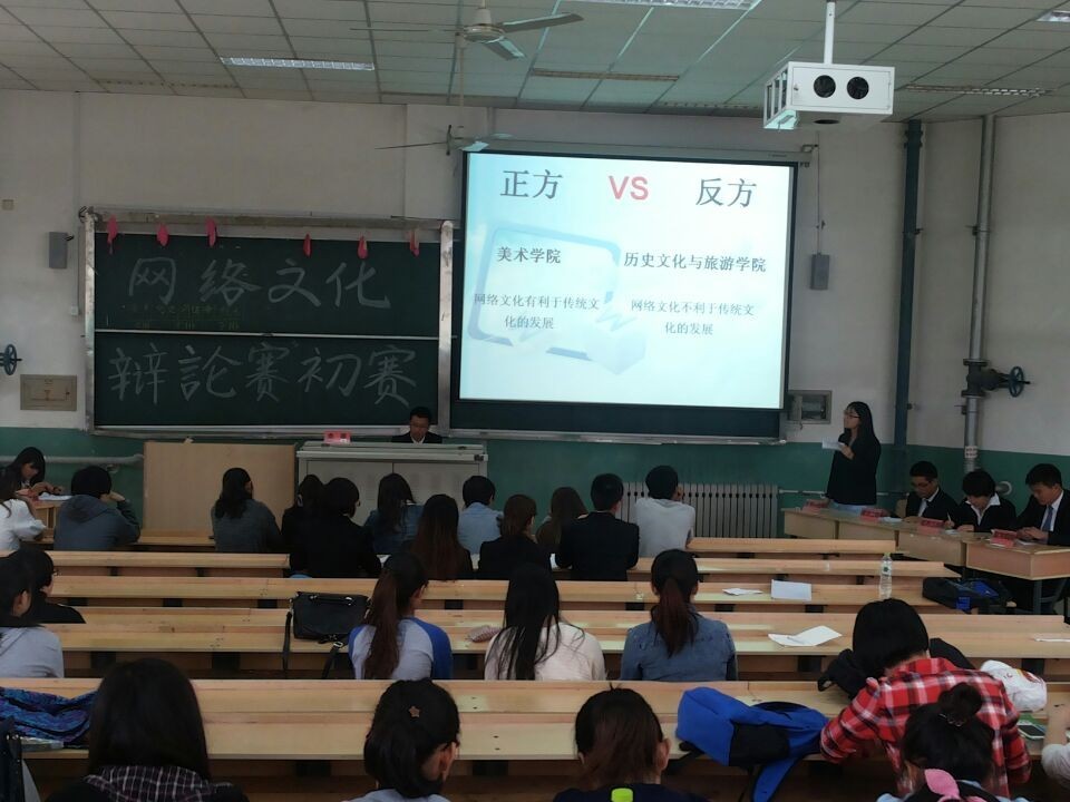 为了提高大学生的综合素质,丰富大学生的精神文化生活,增加同学之间的交流,2014年5月10日,由大学生网络文化传媒中心主办的大学生辩论赛初赛第三场在3237教室举行。