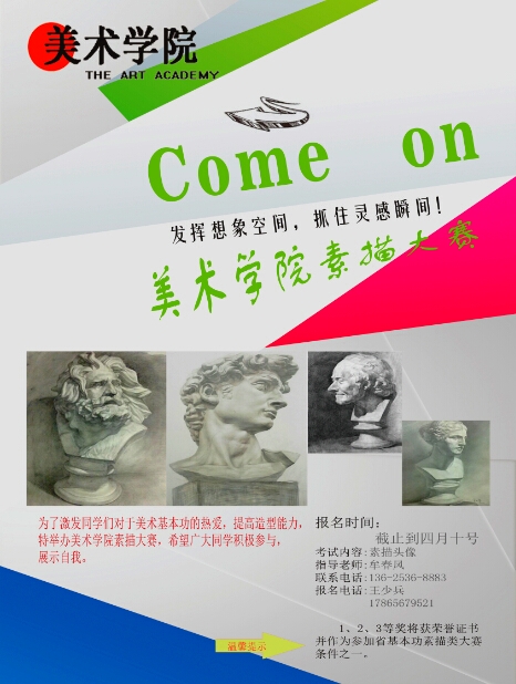 本次即将举办的素描基础技能大赛,营造了同学们的学习气氛,为美术学院日后的学风建设指明了方向,同时美术学院的学子们也将在浓厚的学习氛围中共同努力、共同进步,将学风建设这股潮流之风传递到校园的每一个角落。