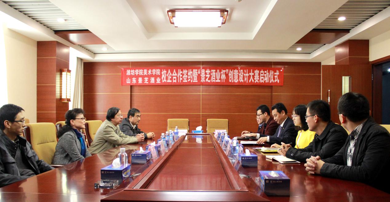 4月13日,潍坊学院美术学院与山东景芝酒业股份有限公司正式达成战略合作协议。在潍坊景芝酒业办事处,美术学院的领导及教授与景芝酒业电子商务有限公司的项目负责人共同出席了“景芝酒业杯”艺术创意设计大赛的启动仪式。