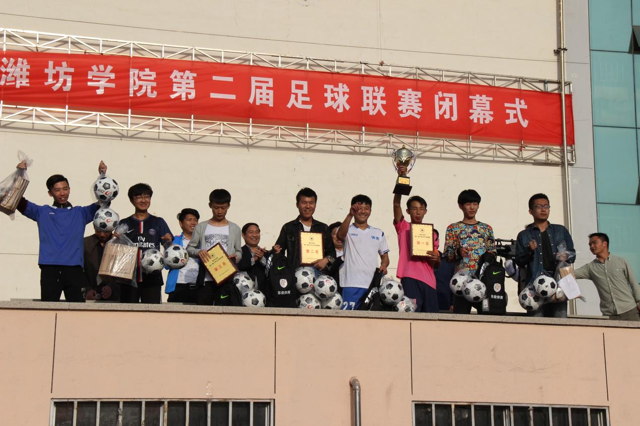 2016年4月15日,由潍坊学院体育运动委员会主办,体育学院承办的“潍坊学院第二届足球联赛”在田径场举行足球总决赛及颁奖典礼。出席本次足球联赛闭幕式的领导有副校长体委主任王清明、学生工作处处长李学军、体育学院院长赵健、副院长刘振堂等。
