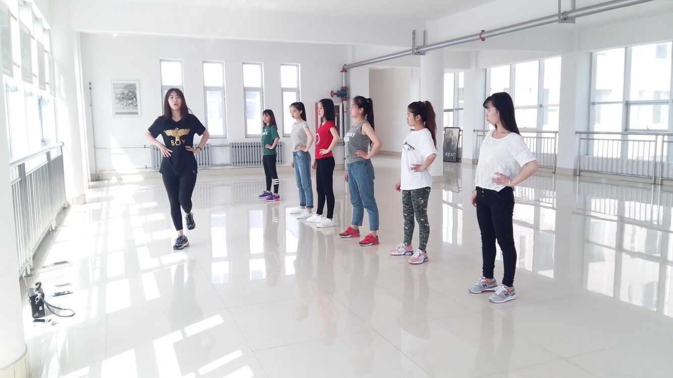在排练开始之前,队长首先带领大家做了热身运动,以免在排练过程中受伤。经过几分钟的准备活动,队长带领大家熟悉学过的动作,认真仔细地纠正队员们的每一个细节动作,并且不断亲自做示范,尽力让舞姿优美。队员们也尽自己的最大努力把动作做到位,虚心接受队长的批评,即使累也不轻言放弃。长长的走廊里,透过太阳的光芒,依稀可见队员们一个个曼妙的舞姿,整齐而修长的身影,使这寂静的长廊多了几分生气。四月的天气,沐浴着春天的阳光,在室内不免有些温热,但是经过长时间排练的队员们依然兴致勃勃,即使汗水浸湿了衣服,也乐在其中。