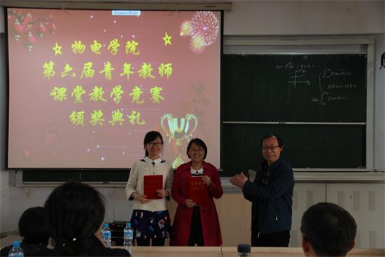 竞赛开始,每位竞赛教师按照提前抽签的顺序开始依次进行限时十分钟的课堂教学。每位老师选择不同的讲课内容,以各自独特的富有创造性的方式进行课题讲解,有的老师诙谐幽默、有的老师严肃认真,不同的授课风格带来不同的课堂教学效果。在十一位参赛教师全部授课结束后,李英德院长做总结讲话。最后,比赛现场公布结果:朱海玲、张鲁筠老师获得一等奖;李秀圣、商勇、许向华、黄小东四位老师获得二等奖;唐艳艳、杨阳、韩锴、张建心、樊心民五位老师获得三等奖。由物电学院院长李英德和院党总支书记仲明礼为获奖选手颁奖。