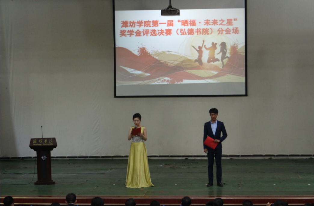 为提高我校大学生的综合素质,我校优秀校友、山东潍坊鑫源金店有限公司董事长曲金民先生捐资100万人民币,设立潍坊学院“晒福·未来之星”奖学金。弘德书院学生秉持着厚德、博学、求是、创新的校训,充分发扬“和衷共济、艰苦奋斗、追求卓越”的潍院精神,积极筹备“晒福·未来之星”的活动。本次评选活动根据10名参赛队员的演讲情况、学习情况和突出表现由评委进行打分。10位同学依次上台答辩,角逐最后的大奖。他们中有的是班长、团支书,也有书院学生会的骨干成员,他们都是品学兼优、全面发展的书院学子。他们在努力学习的同时,不忘积极参与各项活动,提升自己的综合素质。经过初赛投票、复赛选拔和决赛答辩,本次评选活动,董雪同学获得金奖,曹睿、尹智璇同学获得银奖、井卉竹、姜文翰、马世旋同学获得铜奖,曹睿同学获得最佳人气奖。评选环节结束,弘德书院院长陈子富上台作总结讲话,首先,他表示了对曲金民先生的感谢,随后他对同学们的出色表现给予肯定,同时他希望书院学子能够以这些同学为榜样,发挥自己的优势,做一位全面发展的当代大学生。