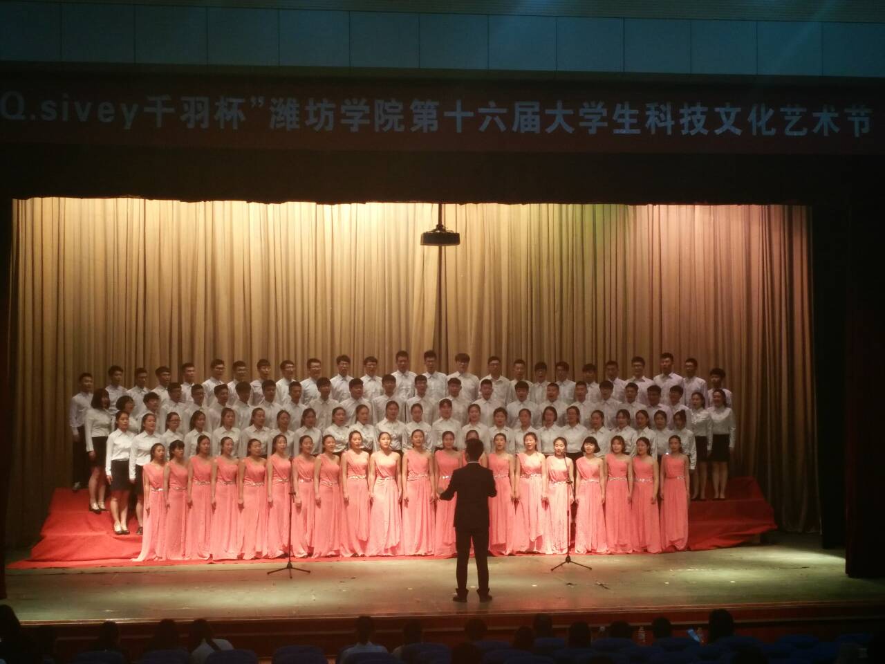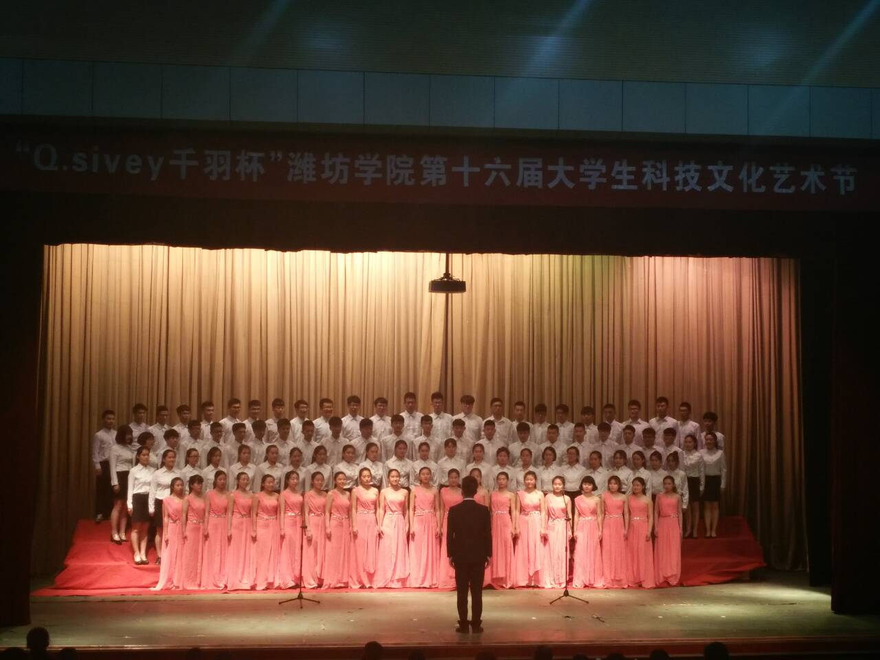 在潍坊学院里,有着一群青年学子正悄悄的计划着为五月添点色彩,他们就是美院的优秀学子。他们激情澎湃的歌声,让人如痴如醉;整齐划一的着装,让人眼前一亮;甜美自信的笑容,让人如沐春风。舞台上,他们自信,他们如花儿般绽放。台下,他们勤奋刻苦,每天都会在校园的某个角落听到他们一次次排练的声响。他们因歌声从不同的班级聚到一起,他们相互鼓励,相互扶持,他们牺牲自己休息的时间排练,只为在这一刻绽放。功夫不负有心人,美院学子以9.66分取得了第九名的好成绩,同学为他们的歌声鼓掌,老师为他们的精神喝彩。一首《我们的中国梦》回荡在图书馆报告厅,飘进同学们的心里。