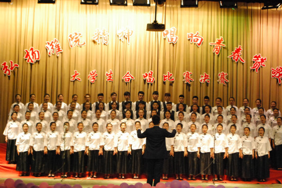 成功进入决赛的有12支队伍,其中外国语学院一路过关斩将,挺进了决赛。张震一直陪大家共同奋斗,在此次决赛的重要关头,他毅然决然担起了指挥的重任。外院第三个登台,井然有序,简单素朴的民国服装,清新亮丽的发型,再加上大家甜美的笑容以及帅气的指挥外院对于这次比赛势在必得。大家唱着《愿亲人早日养好伤》,仿佛一下子回到了抗战时期,乡亲们为战士们熬鸡汤,愿他们早日重返疆场,为国效力。合唱表演最出彩的部分要数三位舞者的绸带伴舞了,红色绸带抛出犹如一条红色的漫漫岁月长河,舞者在这长河中划出了一道道优美弧线,弘扬了外院人在挫折中顽强拼搏的精神。这条长河,引领着我们走向更远的前方。在此期间,外院观众席上气氛高涨,“学好外国语,做好中国人”的口号响彻整个大厅。