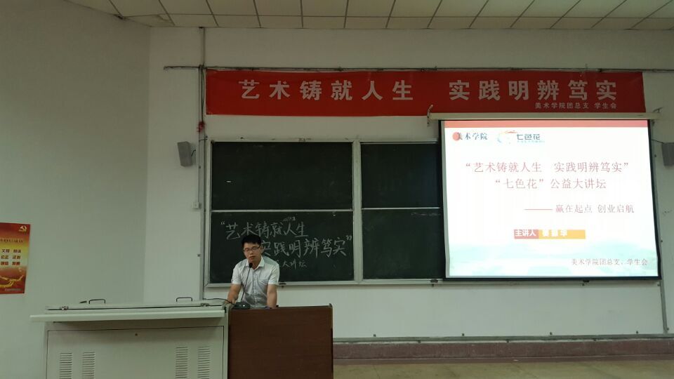 为学习贯彻党的十八大和十八届五中全会精神,深入贯彻落实习近平总书记系列重要讲话精神,围绕学校中心工作,引导青年学生树立正确的就业、创业方向,推动学生全面成长成才,美术学院团总支、学生会于5月27号下午4点在荟萃楼1109召开了“赢在起点,创业启航”暨“七色花”大讲坛活动。