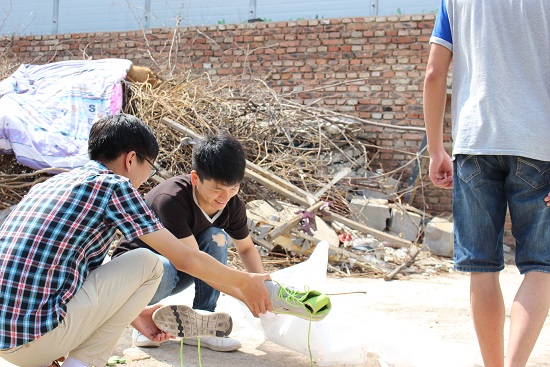 进门之后,周连收自己一个人坐在地上看电视,发现量子服务队的同学来了之后,他的脸上露出了灿烂的笑容,用说的不是很清楚的话语给大家打招呼。由于患有脑瘫,周连收的手脚都不是很方便,唯有一张笑脸特别灿烂。由于环境原因,40平米的房子内异常潮湿,量子服务队的队长侯国奇首先带领大家将屋子里潮湿的泡沫地板一个个拆下来拿到外面晾晒,把他的被子也晒到外面。其它的队员娴熟地收拾着房间,有的打扫卫生,有的整理床铺和衣物,还有队员耐心地与他交流沟通。周连收还拿出了他自己写的字,字写得很工整,能看出他写字时的认真。他还拿出自己珍藏的相册,分享他的故事与喜悦。因为交流不是那么流畅,他想和同学们分享的事情说不清楚时,就拿出笔写下来,虽然交流困难,但看到志愿者们明白了他的意思之后,脸上洋溢出灿烂的笑容。