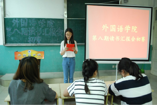 为加强“书香外院”建设,创建学习型外院,全面提升学生整体素质,由外国语学院学生会科技创新中心承办的外国语学院第八期读书汇报会初赛于6月8日3233教室举行。参加此次比赛的有外国语学院各专业的代表,评委分别是党团主任王歆童,青年志愿者联合分会主任徐连娜,大学生自我管理中心副主任张雅琪。