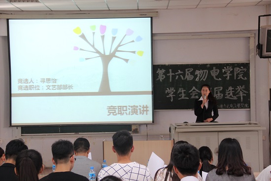 两点三十分,55名竞选者已全部到场,身着正装,严阵以待。两点四十分,竞选演讲正式开始,演讲按照前一天抽签顺序依次进行。本届竞选新增了评委提问环节,根据竞选职位、演讲内容有针对性地进行提问。首先进行的是宣传部,共有3人竞选部长,3人竞选副部长,竞选人主要从自我介绍、竞选优势及工作展望三方面展开演讲。竞选部长的刘春秀讲到可以考虑电子图的设计,这引起了贺书记的兴趣,对刘春秀的想法提出表扬,宣传部可以加强这方面的工作,这样物电学院的宣传板就可以完全由咱们学生自己设计了。竞选文艺部部长的刘增奎因多次提到组织活动丰富学生的课余生活,张芳芳老师对此提出问题,“组织文艺活动与学风建设是否冲突”,刘增奎虽然没有回答地很好,但这个问题引起很多同学的思考,学生会的工作都是为学风建设服务的,学风建设的重要性必须强调和凸显。宿管部的竞选者们都精心准备了PPT,把一年来的工作展现给评委和观众。外联部、女生部、学习自律部、体育部、网络新闻部、量子志愿者服务队、科技创新部都依次进行了精彩的演讲。