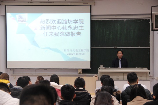 为全面提高物理与光电工程学院学生的语言文字写作水平,写作能力,促进物电学院教学、科研、实验室建设、学风建设等工作及时、有效的宣传。2016年11月6日上午8时30分,物电学院于5210教室开展写作能力和语言学习专题讲座,讲座特别邀请到了潍坊学院新闻中心主任韩永忠,物电学院党总支副书记贺志波、学生工作办公室主任张芳芳及学生会部分学生干部成员聆听了讲座。
