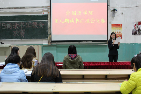 11月17日下午四点半,在外院的3136教室里举办的第九期读书汇报会决赛正式开始。评委团是第十二届学生会主席郭凯新和副主席惠亨利以及第十三届学生会大学生党员示范中心主任崔艳,赛制采取十分制的形式。