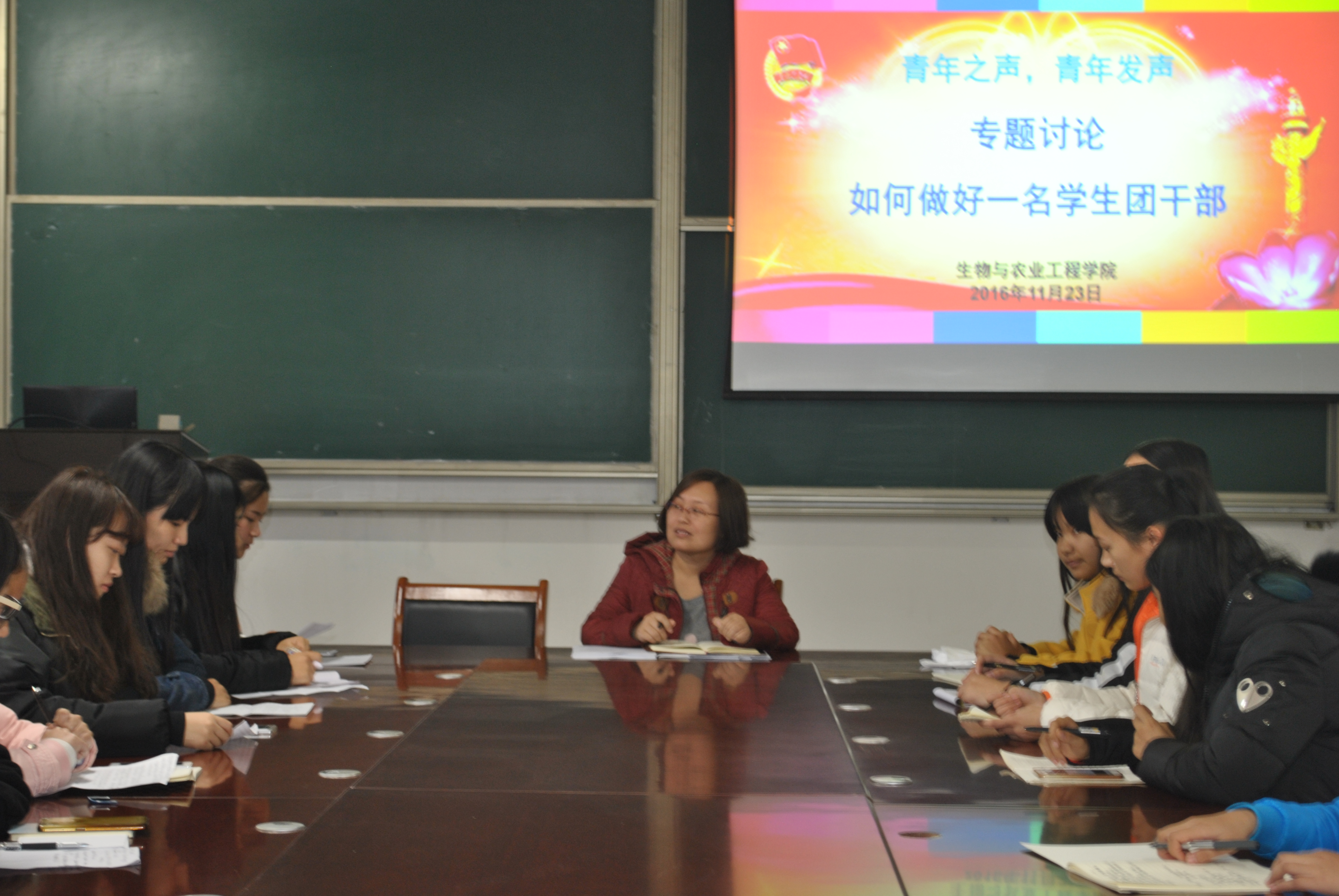 2016年11月22日和23日下午四点十分,生物与农业工程学院团总支先后在人合楼8501会议室举办了以“如何做好一名学生团干部”为主题的专题讨论。本次讨论由学院团总支副书记孙海燕老师主持,2015级全体学生团干部参加。