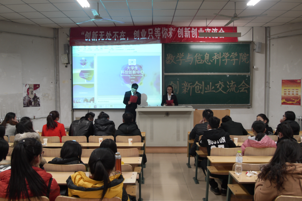 为了使同学们更好地了解什么是创新创业,提高创新创业精神。数学与信息科学学院于11月28日晚上7:00在人合楼8112教室开展了以“创新无处不在,创业只等你来”为主题的创新创业交流会。与会嘉宾是数学与信息科学学院第十六届学生会主席刘凯,秘书长王继秋,副主席李敬洋、王文超,副秘书长韩莹莹以及全体部长。此次交流活动还特别邀请了来自大学生科技创新中心的成员为同学们讲解有关创新创业的各项知识。