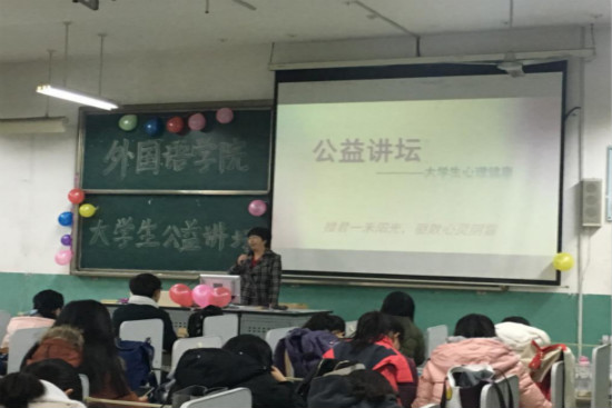 为关爱大学生心理健康,积极响应号召,11月24日晚七点在外国语学院举行了大学生心理健康公益讲座。心理辅导员马老师就大学生心理素质、人际关系、恋爱问题、就业压力等方面为大一新生支招。