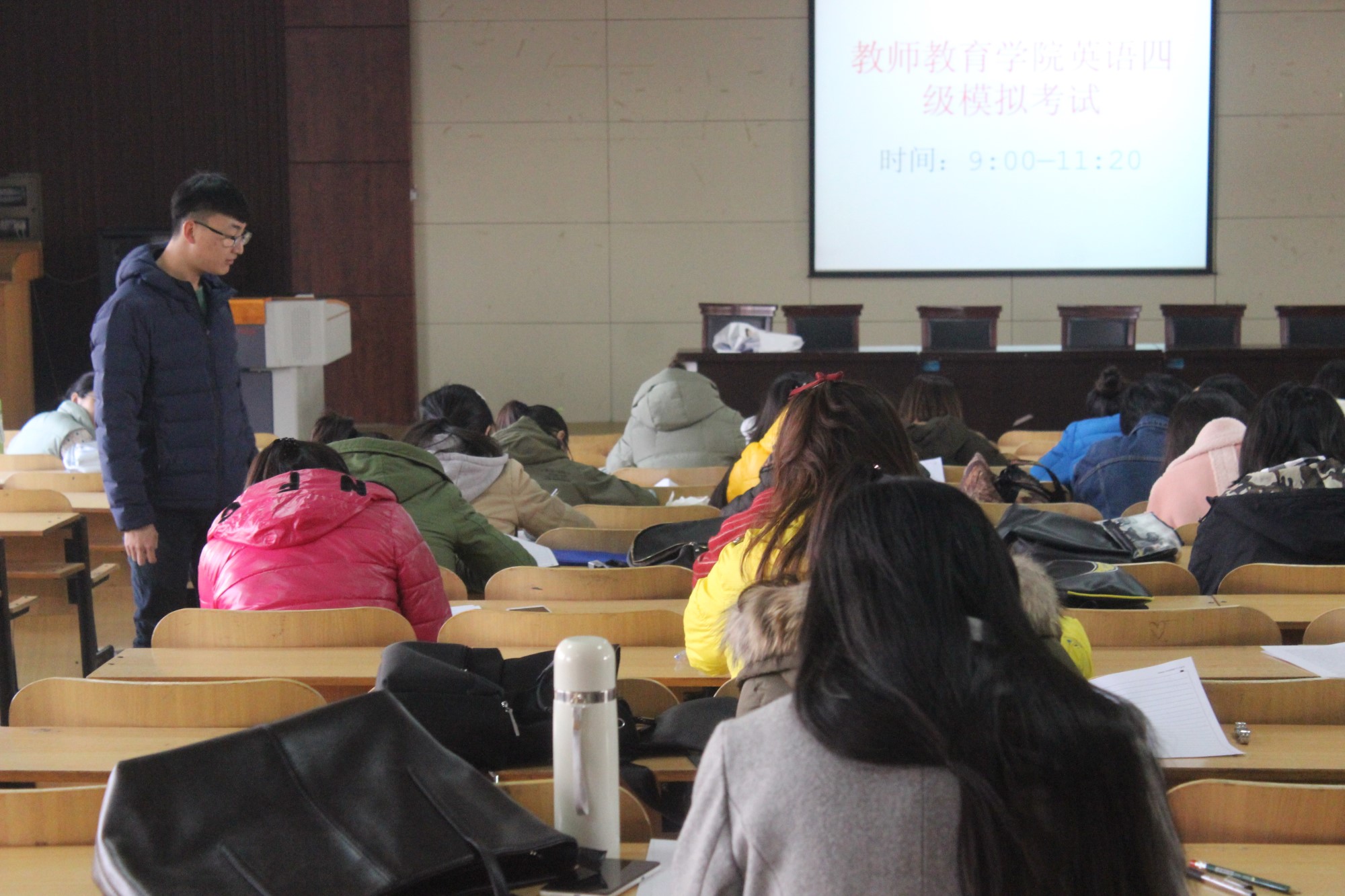 为增强四级考生的备考意识,提高他们的应考能力,2016年12月3日上午九点,教师教育学院在安顺校区6107教室组织了大学生英语四级模拟考试。