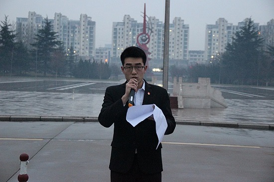 早晨6:30全体学生在行政楼前成仪式队伍集合完毕。伴随着国旗护卫队庄严的护送着国旗入场,升旗仪式正式开始。神圣嘹亮的国歌响起,五星红旗随着朝阳冉冉升起。全体师生神情严肃态度端正的注视着红旗升至到最高点。仪式结束后,学生代表王宏以《追逐中国梦,践行社会主义核心价值观》为题目进行了慷慨激昂的发言中国梦是社会主义核心价值观的具体体现,而实现中国梦,又是社会主义核心价值观的具体践行。随后潍坊学院党总支部书记杜建国做了演讲,做了以下几点要求:一是要注意人身安全和宿舍安全,遵规守纪。二是临近期末,做好复习,应战接下来的期末考试。主持人随后宣布升旗仪式结束。全体学生由班干部按顺序带回了。