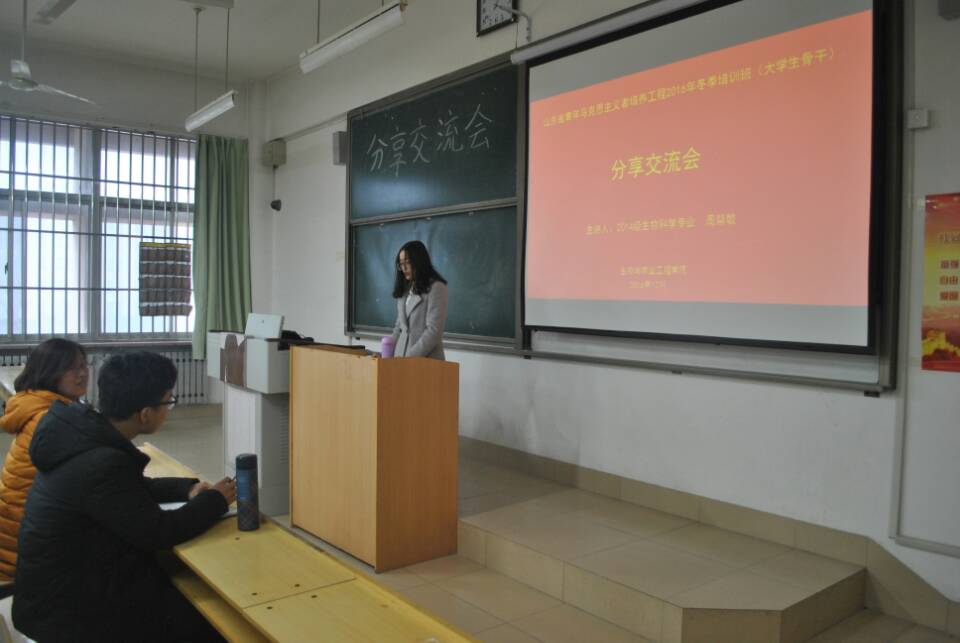 周慧敏同学现为潍坊学院学生会副秘书长、生物与农业工程学院学生会副主席,她作为校大学生骨干代表参加了为期4天的“山东省青年马克思主义者培养工程2016年冬季培训班(大学生骨干)”。培训学习结束返校后,她从青马工程培训班“严”的要求和标准出发,认真总结学习经验与收获,与生物学院的学生骨干们分享学习心得。她表示,身为大学生的我们,应该牢固树立跟党走的信念,严守跟党走的信念,严守作为一名青年马克思主义者的思想阵地。坚持严字当头,认清历史使命,勇于肩负时代赋予的重任;坚持实事求是,弘扬钉钉子精神。交流会上周慧敏学姐还带领大家思考面对目前高校意识形态领域安全问题,身为学生干部的我们应该怎样做。