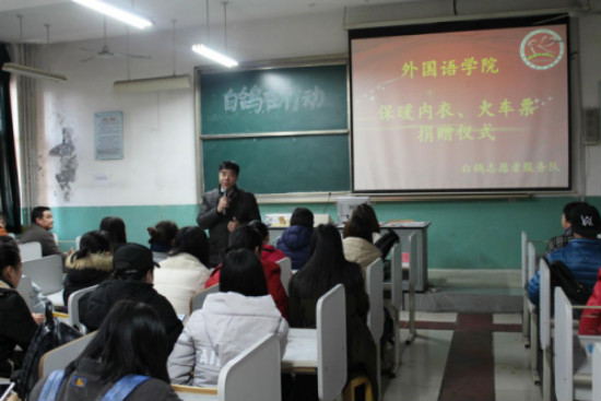 12月23日下午三点,外国语学院在3236教室举办了保暖内衣与火车票的捐赠活动。本次活动由白鸽志愿者服务队承办,捐赠对象为外国语学院各班中家庭情况较为困难与品学兼优的学生。参加此次会议的老师有:外国语学院党总支书记王健,党总支副书记刘希美,副院长张继文,学工办主任马俊玲,团总支书记卢术强以及全体辅导员。