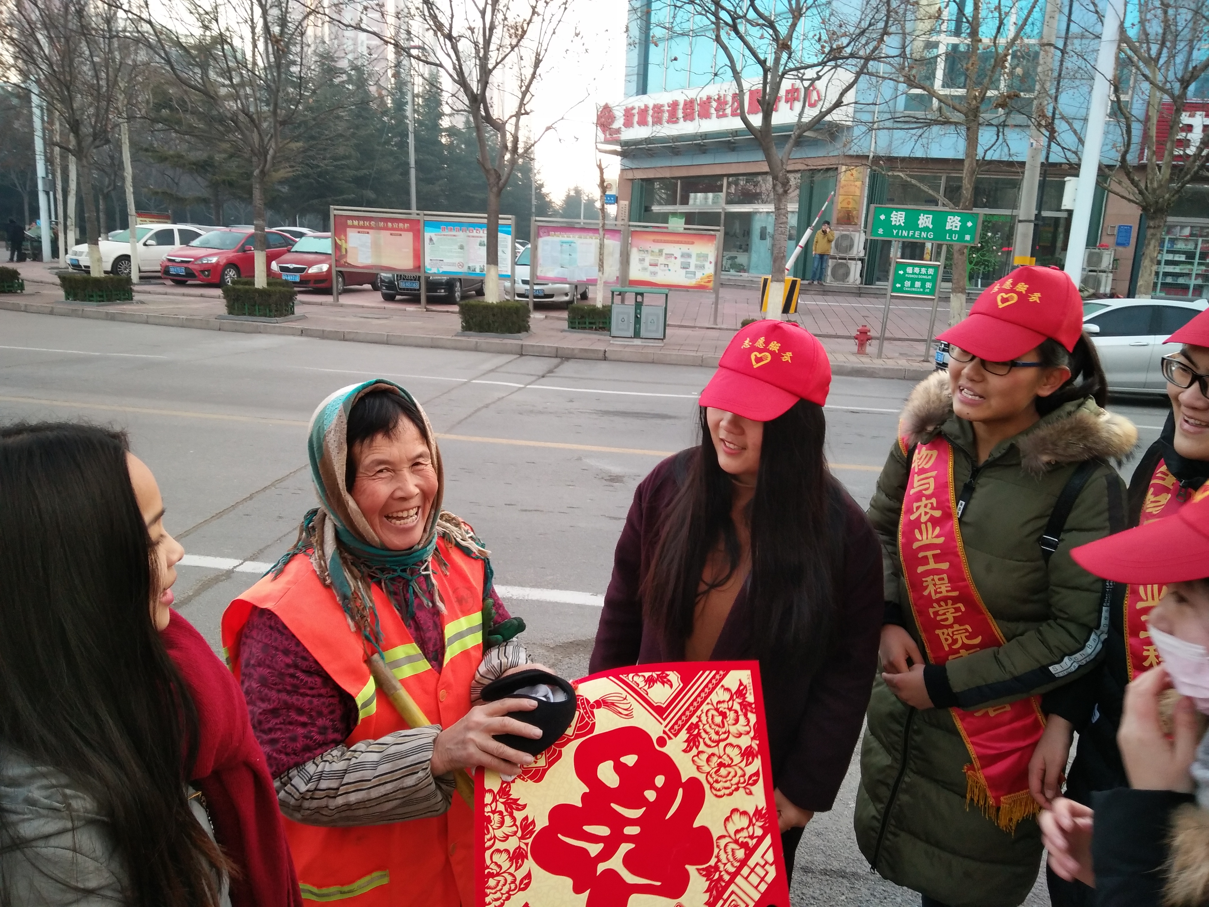 寒风凛冽,但太阳温暖,在学院学生会副主席董晓的带领下,志愿者们来到了街头,为正在清理街道的环卫工人们送去了冬日基本的保暖用具。手套、耳罩虽小,却能够代表生物学院学子的爱心,让环卫工人们感受得到社会对他们关心与体贴。志愿者们在学院领导老师的支持下,还购买了寓意新年祝福的福字和剪纸贴画送给环卫工人。他们与环卫工人交流,了解到大部分环卫工人年纪都很大了,家庭条件也不是很好,有人工人天不亮就开始了一天的工作。对比着干净整洁的街道,志愿者们唏嘘不已,纷纷加入了清洁街道的队伍。