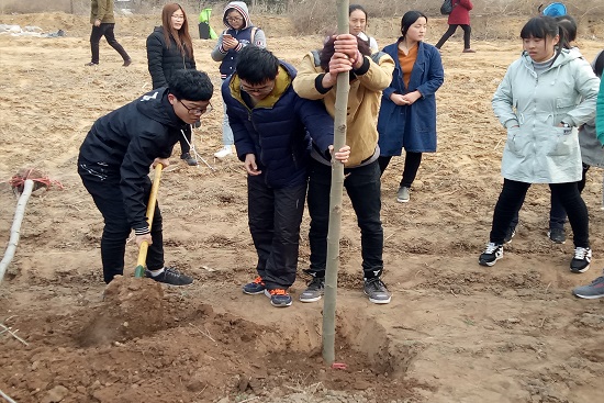 春回大地,万物复苏, 为了增强同学们的绿化意识,践行环保理念,2017年3月12日,在植树节来临之际,马克思主义学院求是志愿服务队全体成员在队长王小彤的带领下,乘车到达潍坊白浪河畔郭家村进行植树活动。