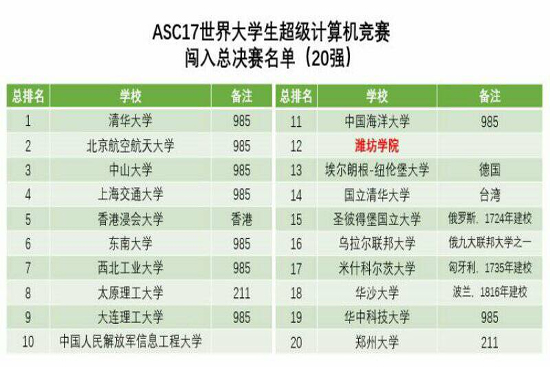 3月13日,ASC17世界大学生超级计算机竞赛组委会发布初赛结果并公布了决赛队伍名单,由计算机工程学院韩立奇与李晓波老师指导、计算机工程学院曹剑、杜雨、侯明山、涂阳、王俊翔等5名同学组成的潍坊学院代表队,在ASC17世界大学生超级计算机竞赛初赛中取得总排名第12位的好成绩,成功晋级20强,闯入总决赛。