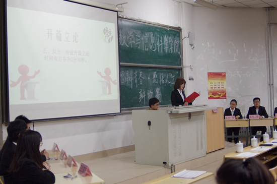 为充分张扬大学生个性,展示个人才能,提高广大学生的口才表达能力和交际水平,3月16日晚7点由数学与信息科学学院团总支学生会举办的“思辩青春,感悟人生”辩论赛初赛在人合楼8122教室拉开帷幕,担任此次辩论赛评委的是数学与信息科学学院第十六届学生会主席团成员,各部门部长及全体秘书。