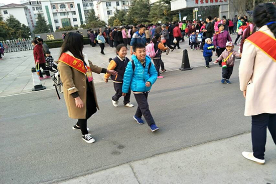 2017年3月17日下午四点半,正值小学生放学的时刻,马路上人来人往,车辆攒动,计算机工程学院蒲公英志愿服务队的志愿者们来到了东明学校。车辆中出现一抹红色的身影,近看,蒲公英志愿者们手拉学生的手,让学生安全过马路,放学时段,车流量与人流量都是最大,蒲公英志愿者服务队心系这些孩子们,所以自愿承担起护送他们放学的任务。有了蒲公英志愿者们,孩子过马路家长很安心。
