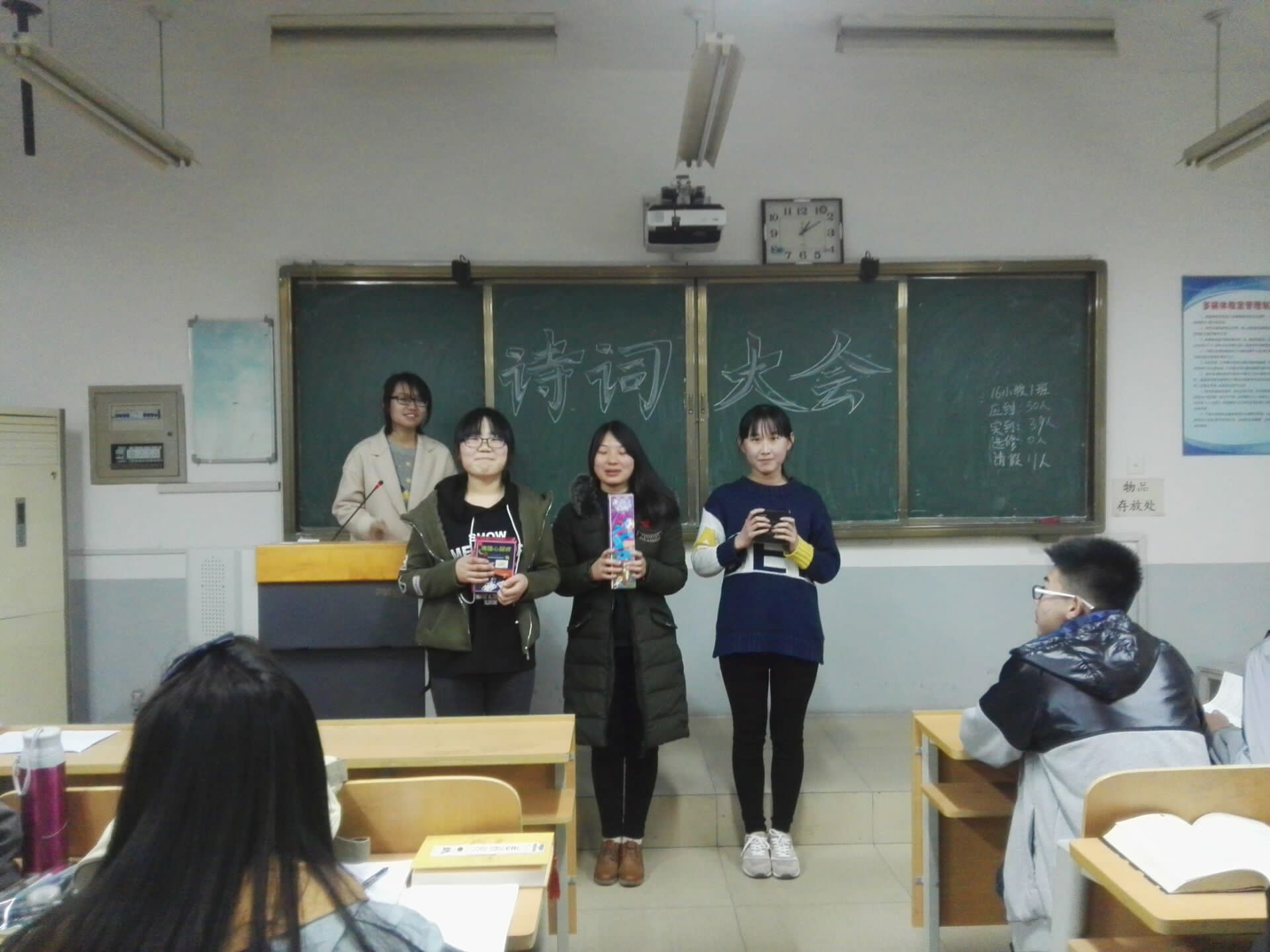 为了让同学们通过对诗词知识的比拼及赏析来重温经典,感受中华传统文化的魅力, 2017年03月17日晚七点,教师教育学院2016级小学教育一班,在本班自习室5402举行了期待已久的国学经典诗词PK。