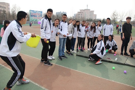 本次比赛一共三个项目,第一个项目是肺活量,每个学院派出三男一女进行比赛,每人吹出的肺活量值以显示屏上数字为准,不计小数,以团队成绩作为排名。第二个项目是卷腹投准,5名队员其中4人并排做仰卧起坐,同时拿海洋球投出,队友拿容器接球,以每分钟投的总数为比赛成绩。第三个项目是搭桥过河,每支队伍10人全部参赛,赛距20米,十人踩着垫子前进,要求脚不触地。十人全部通过终点的用时作为比赛成绩。整场比赛于下午四点圆满结束。