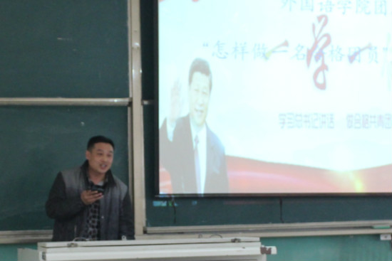 为深入学习贯彻习近平总书记系列重要讲话精神和治国理政新理念新思想新战略,全面推进从严治团,推进共青团改革,潍坊学院外国语学院开展了“一学一做”主题实践活动。2017年4月5日,团总支书记卢术强在至善楼3237教室组织召开了“学习总书记讲话,做合格共青团员”主题团课。参会人员为外国语学院2014级各团支部共青团员。