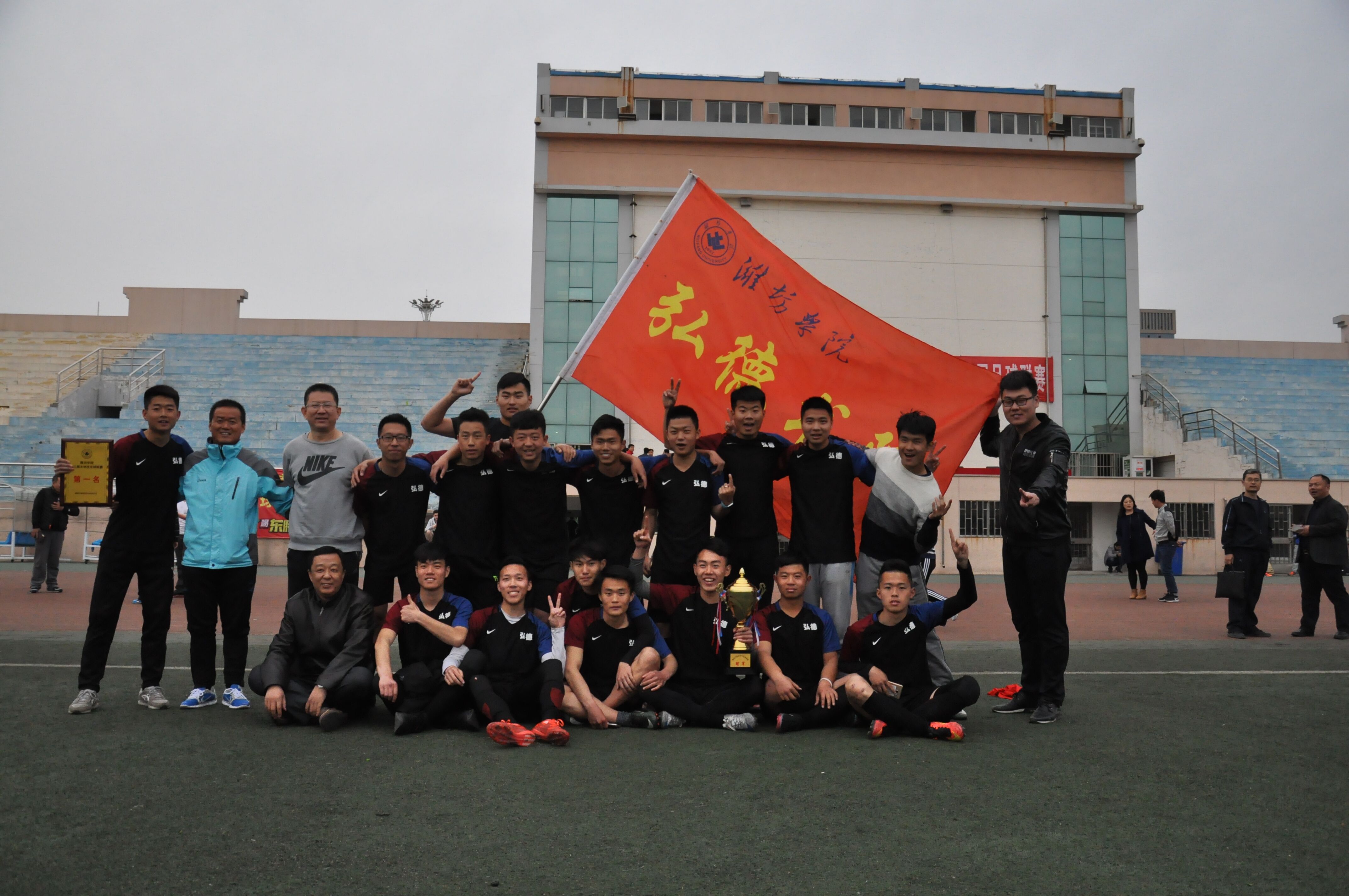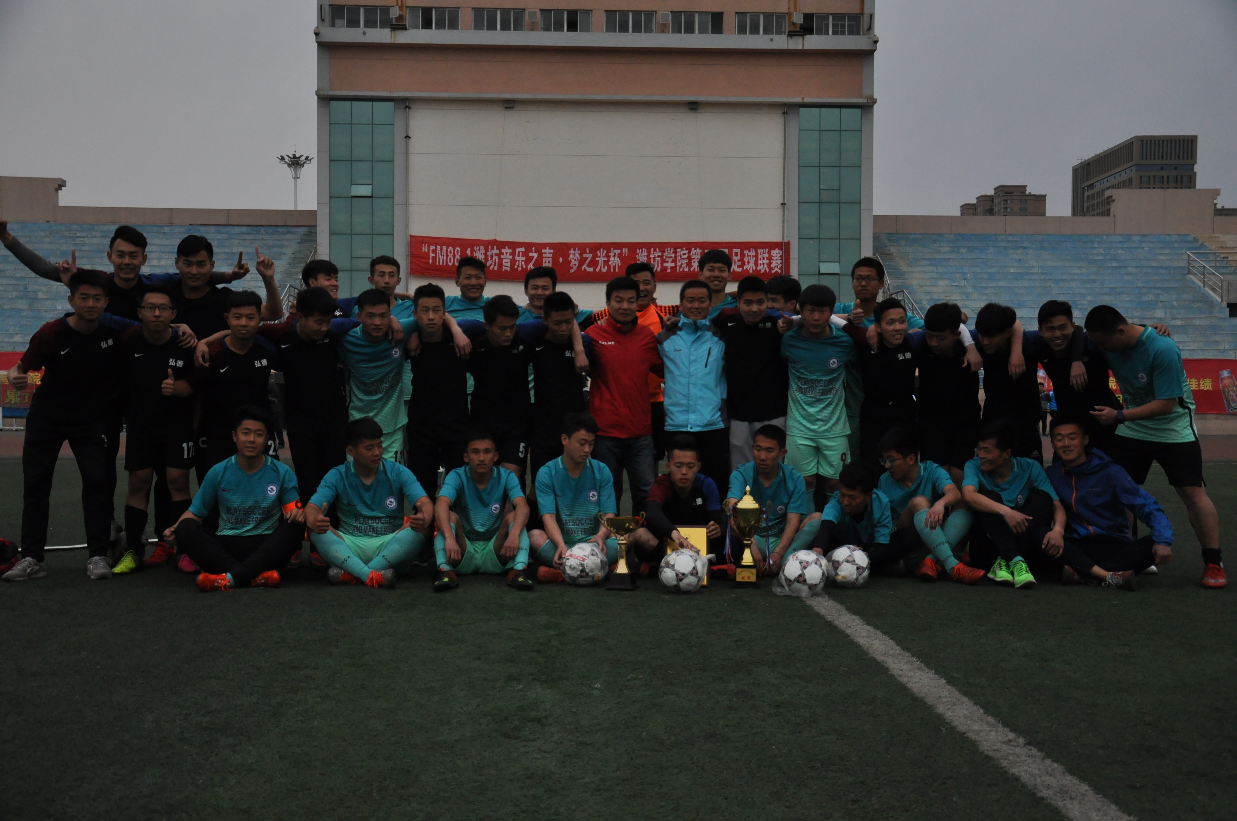 “ FM88.1潍坊音乐之声·梦之光杯”潍坊学院第三届足球联赛在4月10日下午圆满落幕。经过多场激烈角逐,本次联赛中弘德书院代表队荣获冠军。弘德书院院长陈子富、学生工作办公室主任王伦刚出席了此次联赛闭幕式。