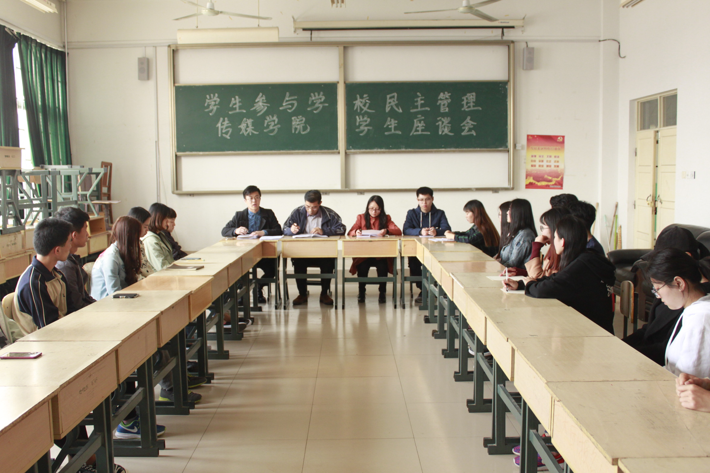 为更好地发挥学生会组织的作用,健全学生权益代表和维护机制,聚焦广大同学精神成长、学习生活、成才发展、权益维护等需求,传媒学院于4月7日在天一楼7414教室召开“学生参与学校民主管理”学生座谈会,学院党总支副书记刘先学,团总支书记杨颂出席了会议,学院学生会主席孙涛,副主席陈勇飞和2015级、2016级学生代表参加了本次会议。学院学生会主席孙涛主持了会议。
