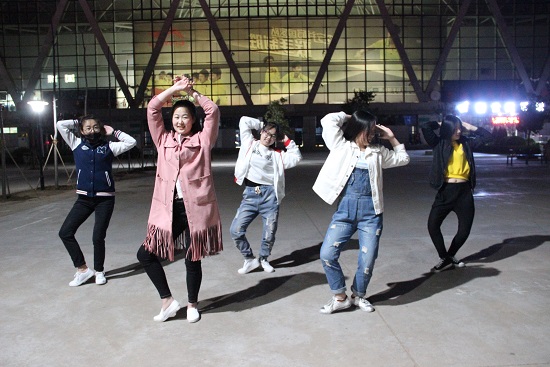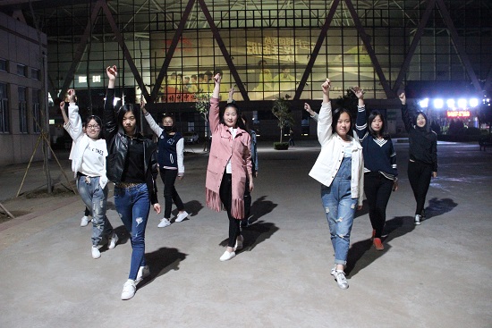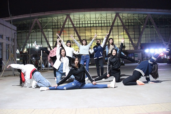 春寒料峭,但啦啦队的姑娘们都活力满满,合着音乐跳了一遍又一遍,动作干脆利落,姿态活泼有力,一节一拍踩着节奏。接着,队员们开始一个一个动作的小细节练习,一个转身,一个跳跃,都力求做到整齐划一、完美到位。随着一遍遍的重复,队员的额头开始沁出汗水,脱掉了外套,在略带寒意的春风里热烈的尽情舞蹈。几遍过后,开始编排结束动作,文艺部部长寻思怡拿着手机看视频上的动作,队员们围在一起,对照视频讨论着动作的设计,每个人的眼中都透露着认真的光彩,从视频上确定了几个动作后,队员们开始互相配合各自分配动作,有的下一字马,有的下腰,有的扳腿,几次修改后,最终的结束动作确定下来,队员们开心的抱作一团,稍作放松。