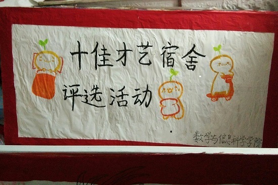 4月12号晚上八点半,数学与信息科学学院学生会宣传部就已经把这一主题的刊板画好了,这其中充分展现了宿舍也应是一个良好的学习环境。“十佳才艺宿舍”,这不仅仅是一个活动,同时也是一份信仰,激励着同学们要爱护宿舍,争做文明宿舍,同时,也增进了同学们的生活乐趣。十佳宿舍,不单单只是一个名字,规范的宿舍卫生标准也是必不可少的,地面是否干净,被褥是否整齐,书桌上是否有杂乱物品等等,都是其中的评判标准。春天是一个舒适的季节,同学们也都应走出宿舍,创造良好文明的宿舍。这一活动,激励着同学们发挥自己的特长,展现自己积极向上的一面。文明,健康,干净,整洁,舒适,才是宿舍应有的良好风貌,才会给同学们创造良好的学习环境。